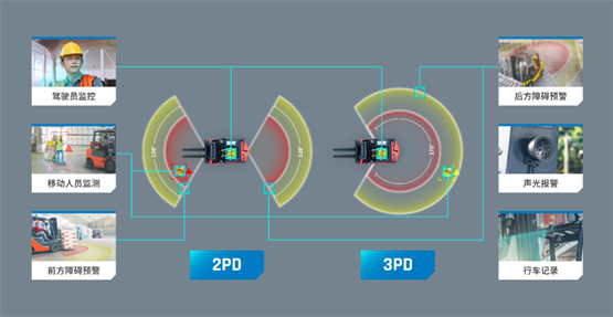 AI精准防撞监测及预警:通过高精度摄像头与AI算法,实时识别车辆行进路径上的行人或障碍物,场所人员无须佩戴标签即可实现AI精准防撞,2PD或3PD不同防撞配件组可灵活选择。用户可根据自身需求设定报警速度,一旦超过预设值,即发出声音报警,并自动减速或制动,有效避免碰撞事故发生。