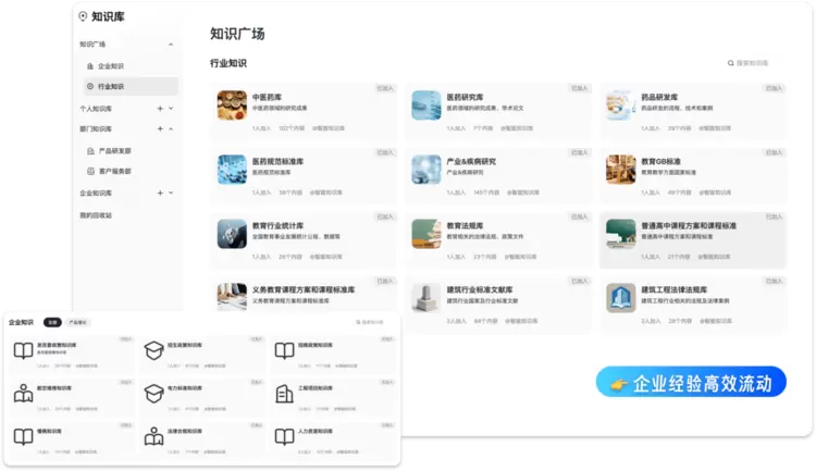 企业经验高效流动:产品专为企业打造专属知识广场,汇聚企业内各类知识库与行业知识库,系统地沉淀组织内的知识,把个体经验转化为组织“流动资产”,支持体系化沉淀、共享与再学习,让知识在内部高速循环并持续创造价值。