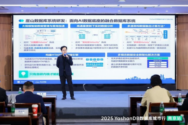 在本次活动的核心技术分享环节,深算院首席产品官 & 崖山科技副总裁王南、深算院技术总监&崖山科技技术副总裁欧伟杰博士,分别从 “核心系统替代能力” 与 “AI 时代数据管理” 两大维度,解读 YashanDB 的技术突破,打消行业 “不敢替、替不好” 的顾虑。