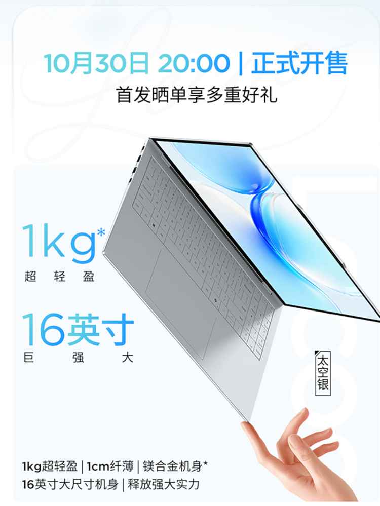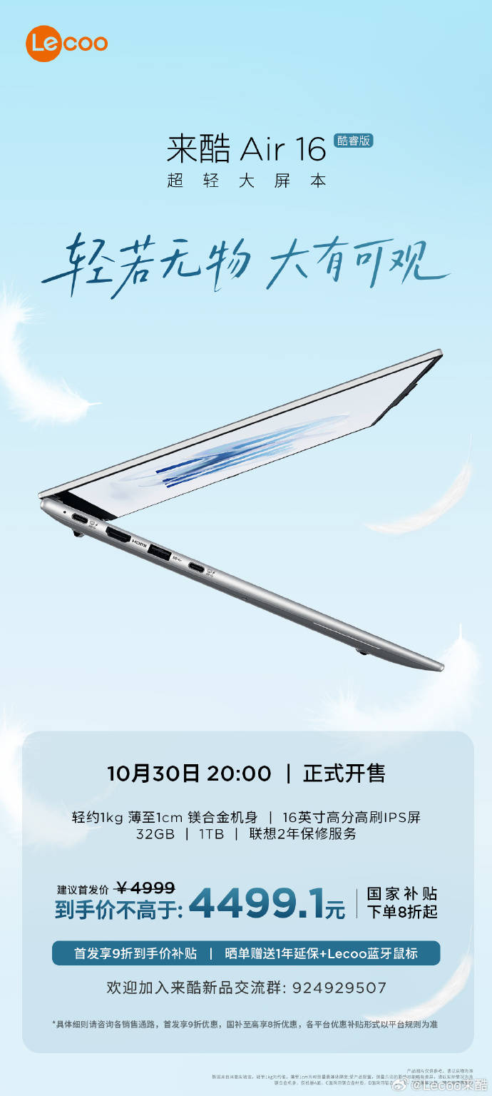 在追求效率与便携的时代,用户对笔记本电脑的要求已不再满足于简单的“轻”或“大”,用户更希望渴望在轻盈机身中容纳更广阔的视野。然而长期以来,“大屏”与“轻薄”似乎难以两全。正是在这一市场诉求下,来酷Air 16以“巨轻薄 巨有料”的姿态横空出世。该产品精准定位追求极致便携与大屏体验的用户,通过将16英寸大屏融入1085g的机身,再搭载高性能的硬件配置、极具竞争力的价格以及完善的品牌服务,重新定义了主流价位大屏轻薄本的至高标准。来酷Air 16于10月30日晚8点正式开售,首发享9折优惠,首发价4999元,到手价不高于4499.1元,部分地区国补可享8折优惠。