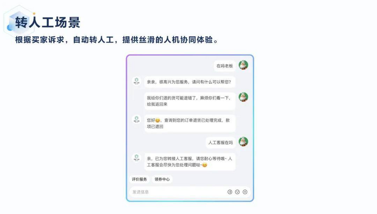 在实际应用中,系统展现出强大的上下文语义理解能力,通过思考推理给出准确答案,内测数据显示解决率达到90%以上。当遇到超出AI处理能力的问题时,无缝转人工机制确保服务不中断,为用户提供连续流畅的体验。