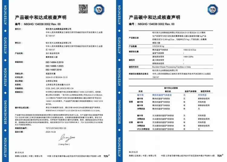 哈肉联的碳中和实践注重科学验证与第三方背书:此款哈尔滨红肠已通过TÜV南德(国际权威第三方检测机构)依据ISO14068标准的核查认证,从碳足迹核算到碳中和认证,每一步均符合国际规范。同时采用“减排为主、抵消为辅”的策略——先通过全链路减碳降低大部分排放,剩余无法避免的少量排放,再通过碳汇项目抵消。