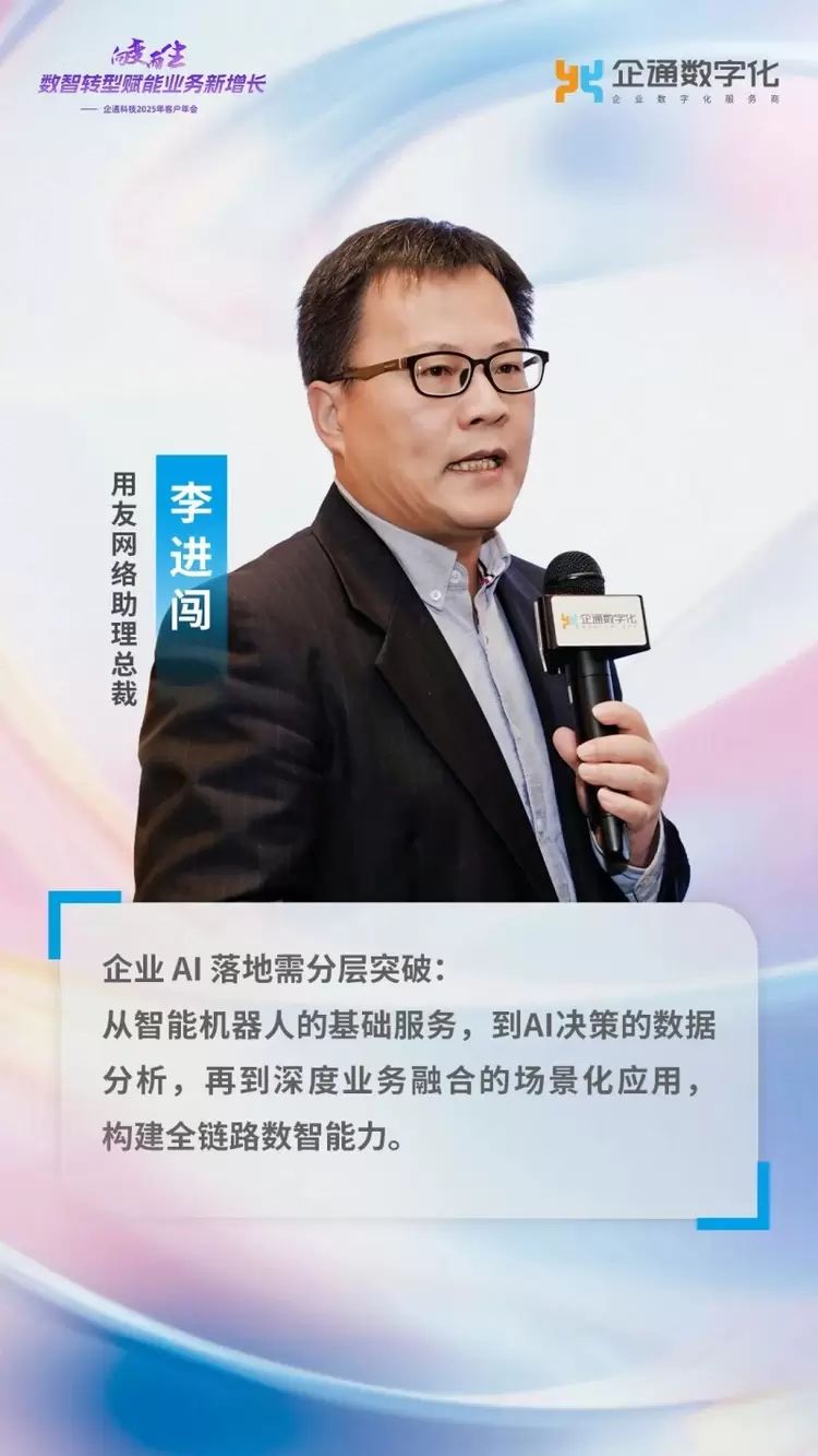 用友网络助理总裁李进闯先生带来《从数据到决策 —— 企业 AI 场景化突破与价值跃迁》的精彩分享,通过 AI 在企业场景的实战案例,详解如何将 AI 转化为可落地的生产力。他结合用友 YonSuite AI 的应用实践,展示了企业如何通过数据决策模型打破 “AI 落地难” 的困局,实现增长重构与核心能力重塑。