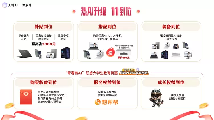 面对大学生群体,联想此次也特别规划了精准的“到位”支持。在核心的购买权益层面,学生凭有效认证可在多重补贴基础上再享专属教育优惠,部分机型累计最高优惠达4000元。值得一提的是“青春有AI全家桶”套装,学生用户只要同时购齐AI PC、AI平板与AI手机三款核心设备,即可额外获得2000元“智享金”。这笔资金可自由兑换平台内丰富的软件、服务与周边产品,全面覆盖AI学习、AI生活与AI娱乐三大维度,真正实现了对大学生校园全场景需求的精准支持与个性化满足。与此同时,联想也同步优化了服务权益与成长权益,提供99元起的保值换新服务,并将携手AI导师开展校园活动,将前沿的智能体验和AI装备直接带到学生身边。