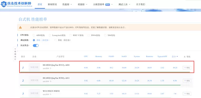 - 性能登顶!华为擎云 W515y获工信部五所台式机性能榜第一