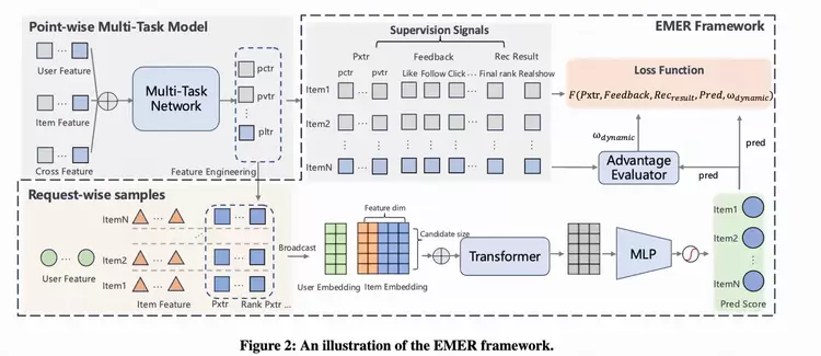 传统方法本质上是让模型为每个视频“单独打分”,但排序的真谛在于“比较”。快手推出的EMER框架的核心突破在于,它让AI模型学会了在同一批候选视频中进行比较和选择,更贴近真实的推荐场景。同时,EMER构建了一套基于“相对优势满意度 + 多维满意度代理指标”的方法体系,形成有效的监督目标,从而精准量化并持续优化用户满意度。