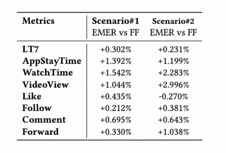 EMER 框架并非理论方案,而是经实战验证的 “增效利器”。从实验数据来看,效果超出预期,对比传统人工公式,快手极速版七日留存提升0.196%、停留时长提升1.392%;快手App七日留存提升0.133%、停留时长提升1.199%,单列短视频观看次数提升2.996%,实现多目标均衡增长。
