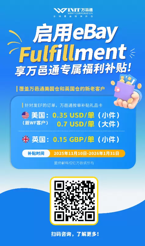 2025年11月,万邑通美国仓和英国仓将正式启动eBayFulfillment,助力卖家提升派送时效,降低配送成本和操作复杂性,为eBay卖家带来更佳的产品曝光、更安心的出海体验,同时也为消费者提供更稳定、更具保障的派送服务。