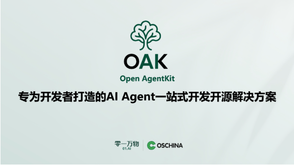 正是基于这样的初衷,零一万物和开源中国正式发起OAK(Open AgentKit)开源项目,旨在与全球开发者共同打造一款开放、通用的AI Agent开发平台。