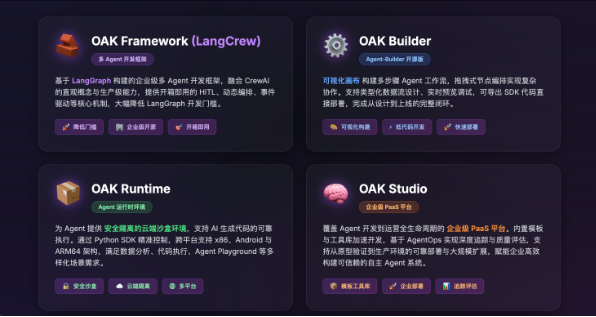 OAK Framework(LangCrew) 已正式上线GitHub,欢迎开发者体验与反馈:https://github.com/01-ai/langcrew 。
