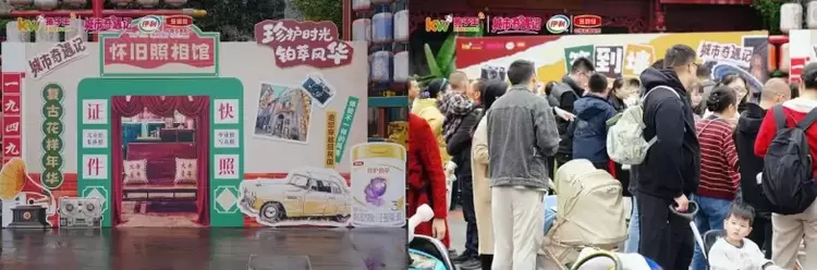 如果说四大体验空间是 “内功”,那么沉浸式主题秀则成为本次城市 IP 的 “破圈利器”,以强话题性实现效果放大:悠扬喜乐中,红绸喜字花轿入场,孩子王携手伊利金领冠通过还原老成都街巷场景,再次展现了其强大的场景创造力和对目标家庭情感需求的精准把握;新娘乘坐黄包车巡游、旗袍模特队列行进的画面,让家长在沉浸式场景中重温经典,孩子则在观察中感受传统文化。