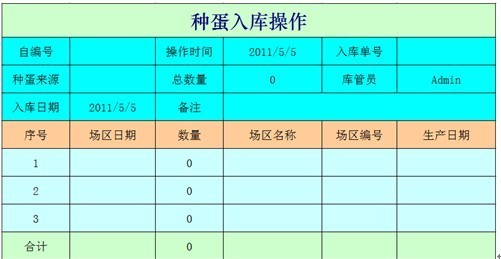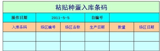 将上传到EXCEL电子表格中的条码复制粘贴到入库条码列中,并自行编写利于记忆的临时编号,如RK0409B,表示4月9日B场生产的种蛋的入库条码等,仅起到临时的助记功能,无实际意义,依个人习惯决定。粘贴条码后,依据编码原则方法,系统利用公式自动填写其余内容。
