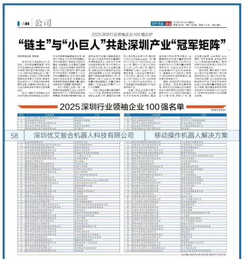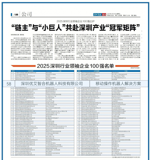 优艾智合荣登2025 深圳行业领袖企业 100 强 工业具身智能实力获认可