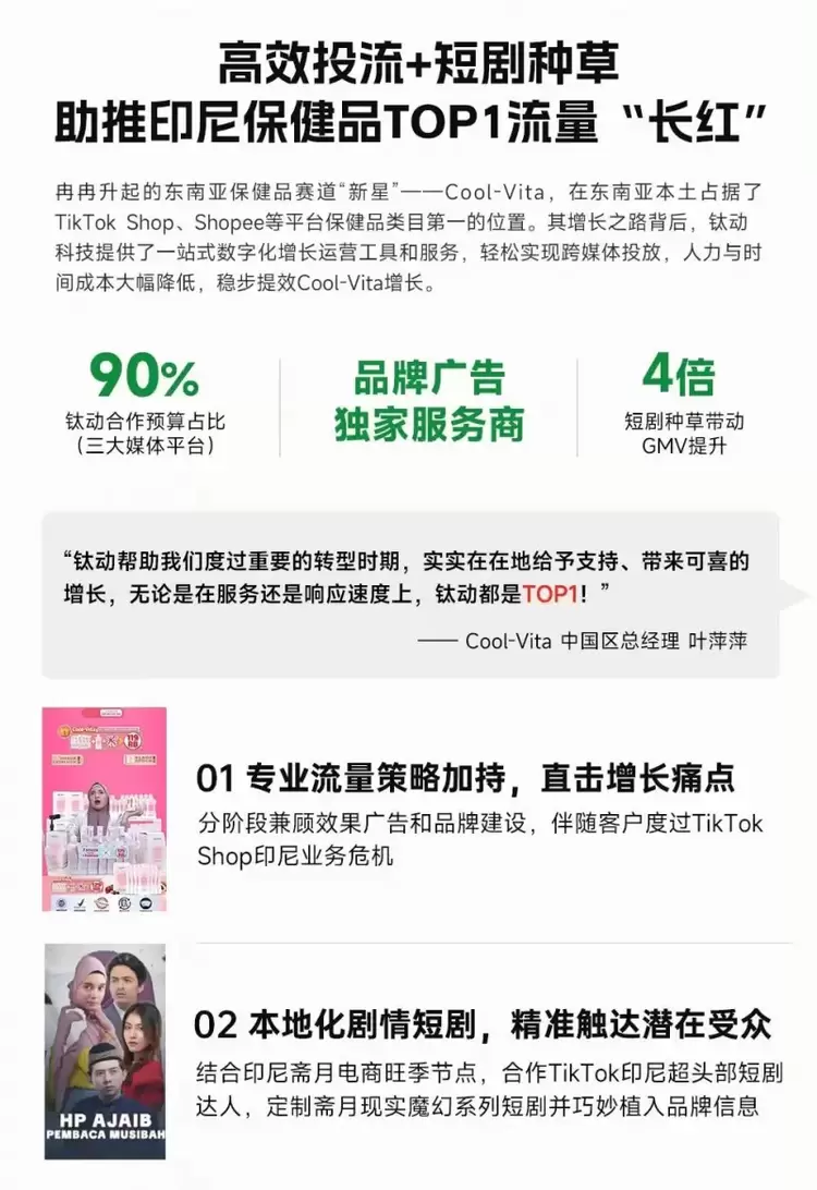 Cool-Vita作为东南亚保健品赛道新兴品牌,近年来专注于健康美容产品,成功在三年内迅速崛起并成为TikTok Shop、Shopee等平台保健品类目领先者。在Cool-Vita增长之路背后,钛动科技提供的一站式数字化增长运营工具和短剧营销项目发挥了关键作用。