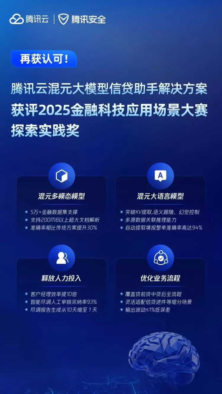 2023 年以来,受贷款利率走低、对公信贷市场下沉等影响,金融机构面临项目规模小、数量多的挑战,需要持续加速推进线上化、数字化、智能化转型。腾讯云基于 30 多家金融机构调研,精准把握信贷全流程痛点,历经两年研发打造混元大模型信贷助手,通过场景化后训练和工程开发构建多模型智能体,实现业务准确率、效率与成本的动态平衡。