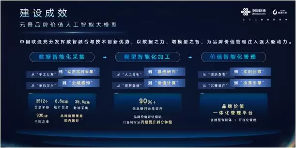 元景品牌价值人工智能大模型针对品牌建设中品牌价值评估量化“难”、资源要素配置指导“难”、品牌国际化精准作战“难”三大难题,依托中国联通数智融合、自主创新的经验,发挥大数据与人工智能领域优势,研发了管理驾驶舱、企业决策站、指标导航仪三大智能化解决方案,构建了企业品牌管理的数智化核心支撑平台,实现了“读得懂财报、算得出价值、说得清归因”的全流程能力。