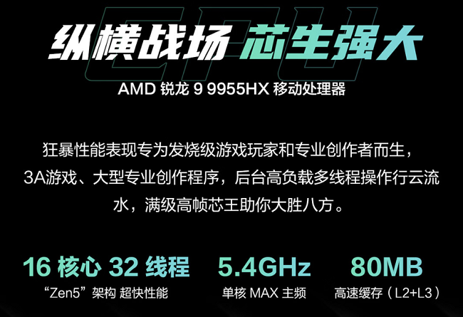 对于电竞游戏的体验来说,处理器性能也扮演着十分关键的角色。天选6 Pro锐龙版采用全新的AMD 锐龙 9 9955HX处理器,“Zen 5”架构16大核,单核最高加速频率5.4GHz,拥有80MB高速缓存。卓越的核心规格与性能可助力玩家在竞技游戏中获得更好的帧数体验,同时在团战、多人同屏等画面下保持帧数稳定。
