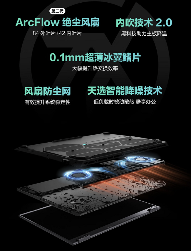 为保障玩家持久游玩的体验。华硕天选6 Pro升级全新的冰川散热系统。配备双二代Arc Flow绝尘风扇,双叶轮设计驱动更高气流流通并减少功率损耗。贯穿式后出风设计搭配内吹技术2.0高效排出废热,同时避免了侧出风设计烘手、挤占接口空间等痛点,更加人性化体验更优秀。在玩家无需电脑输出高性能时,天选6 Pro还有智能降噪技术在低负载时被动散热,静享学习办公。