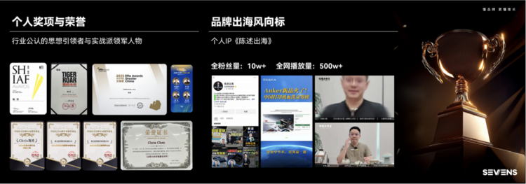 2018年,陈勇创立赛文思,以“增长”为核心坐标,系统化整合全球资源网络,以前瞻性策略构建品牌飞轮,推动品牌实现可持续的海外扩张,迄今已赋能SHEIN、DJI、ANKER等500余家企业成就全球增长,屡创品类领先地位。2020年,赛文思成为首家荣获金投赏全场大奖的出海服务商,奠定其行业标杆地位。