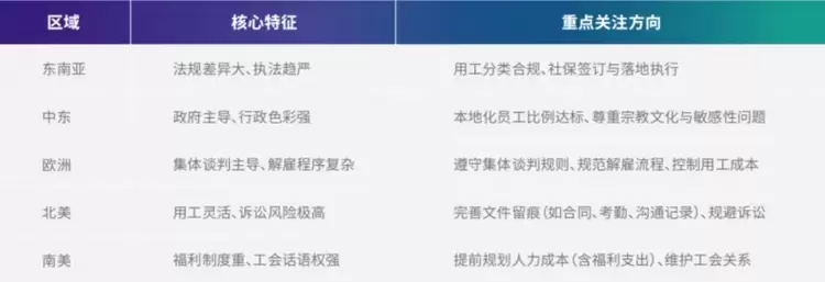 白皮书揭示,各区域的合规挑战呈现出鲜明的特色。例如在东南亚,企业面临的是“高保护性法规与灵活用工文化”的复杂交织,重点在于合同签订的规范性、社保缴纳的强制性以及解雇程序的合法性;而在中东,挑战则集中于“强政府主导与本地化配额”的刚性要求,合规核心是满足沙化(Nitaqat)等本地化雇佣政策,并严格遵循薪资支付系统(WPS)等行政规定;当视角转向欧洲,企业必须应对“强工会介入与高程序正义”的治理环境,任何重大决策如裁员或搬迁,都必须经过与工人委员会(Works Council)的法定协商程序;对于在北美运营的企业,核心风险在于“任意雇佣(At-Will Employment)制度下的高诉讼风险”,要求企业具备极强的证据留存与合规流程管理能力;而在拉美,强大的工会力量和倾向保护员工的司法体系,要求企业将工会沟通与劳资关系管理置于优先位置。