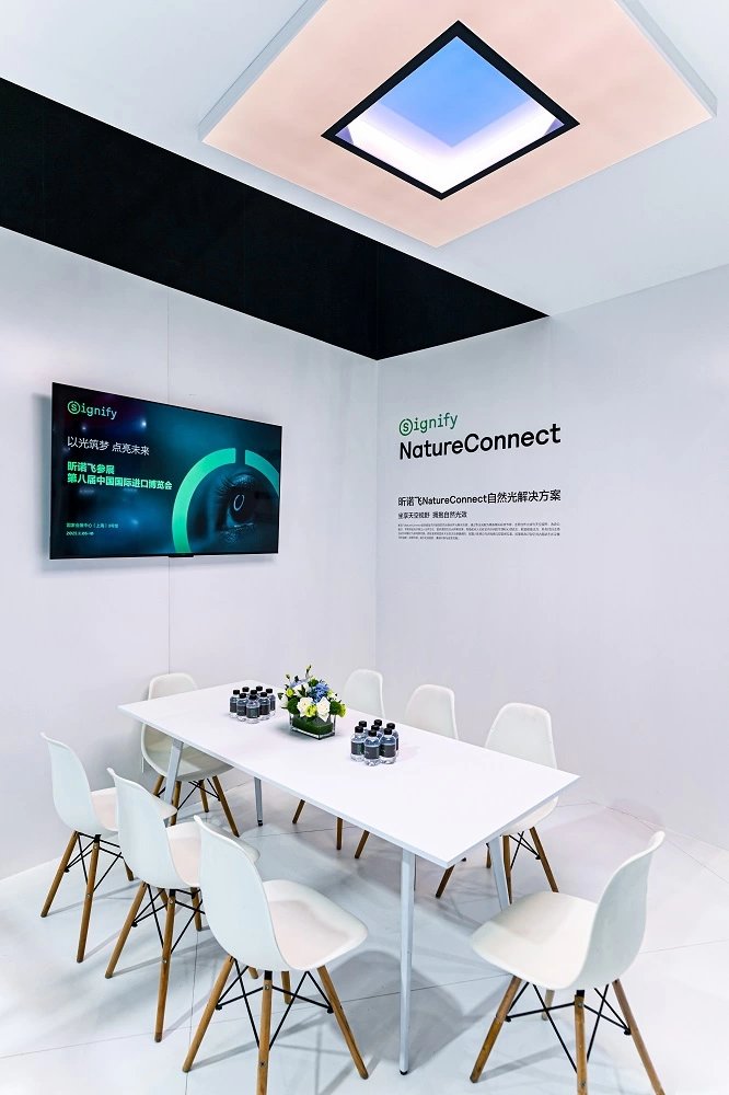 自然光始终与人体节律同频,对健康的影响至关重要。昕诺飞NatureConnect自然光解决方案通过本届进博会正式登陆中国市场。该方案突破室内照明局限,通过专业光配方精准模拟昼夜节律,还原自然光效与天空视野,为办公、医疗、零售等室内环境提供理想的日光照明效果,从而帮助优化人们在室内空间的生理和心理状态。系列灯具可以支持自动节律模式与多场景切换,精准识别空间占用状态并采集日光强度,按需照明,兼顾环保与成本控制。