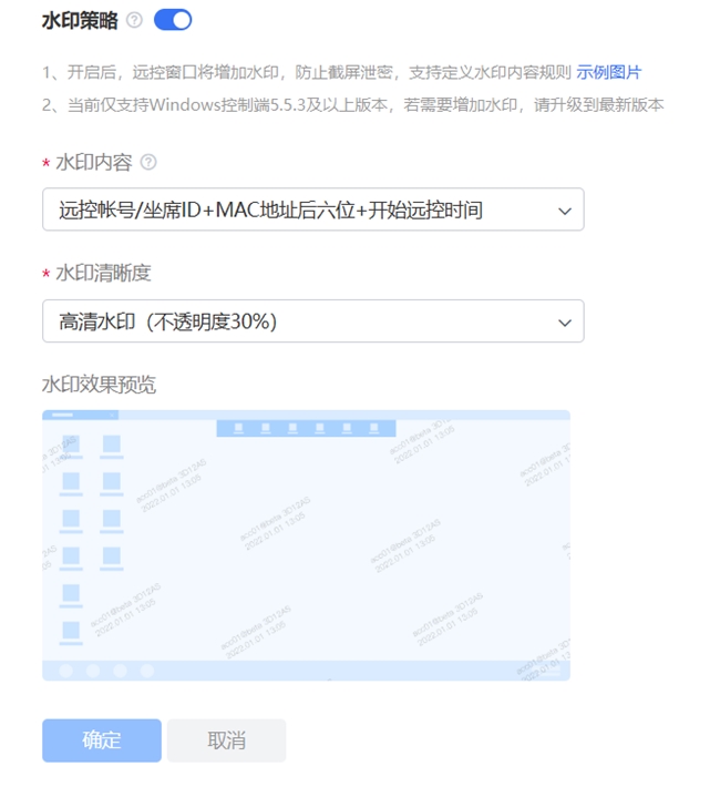 同时,贝锐向日葵还支持开启“远控水印”功能,可在桌面控制、桌面观看、远程摄像头、远程文件、远程CMD/SSH等功能场景下生效,支持调整水印内容与清晰度,适用于不同的安全远程办公场景和需求。