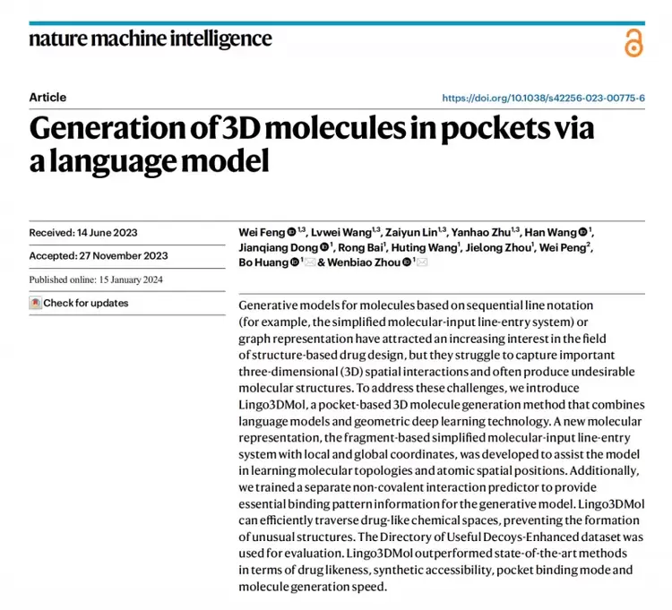 2024年,望石智慧在《Nature Machine Intelligence》发表重磅研究成果,正式推出Lingo3DMol。