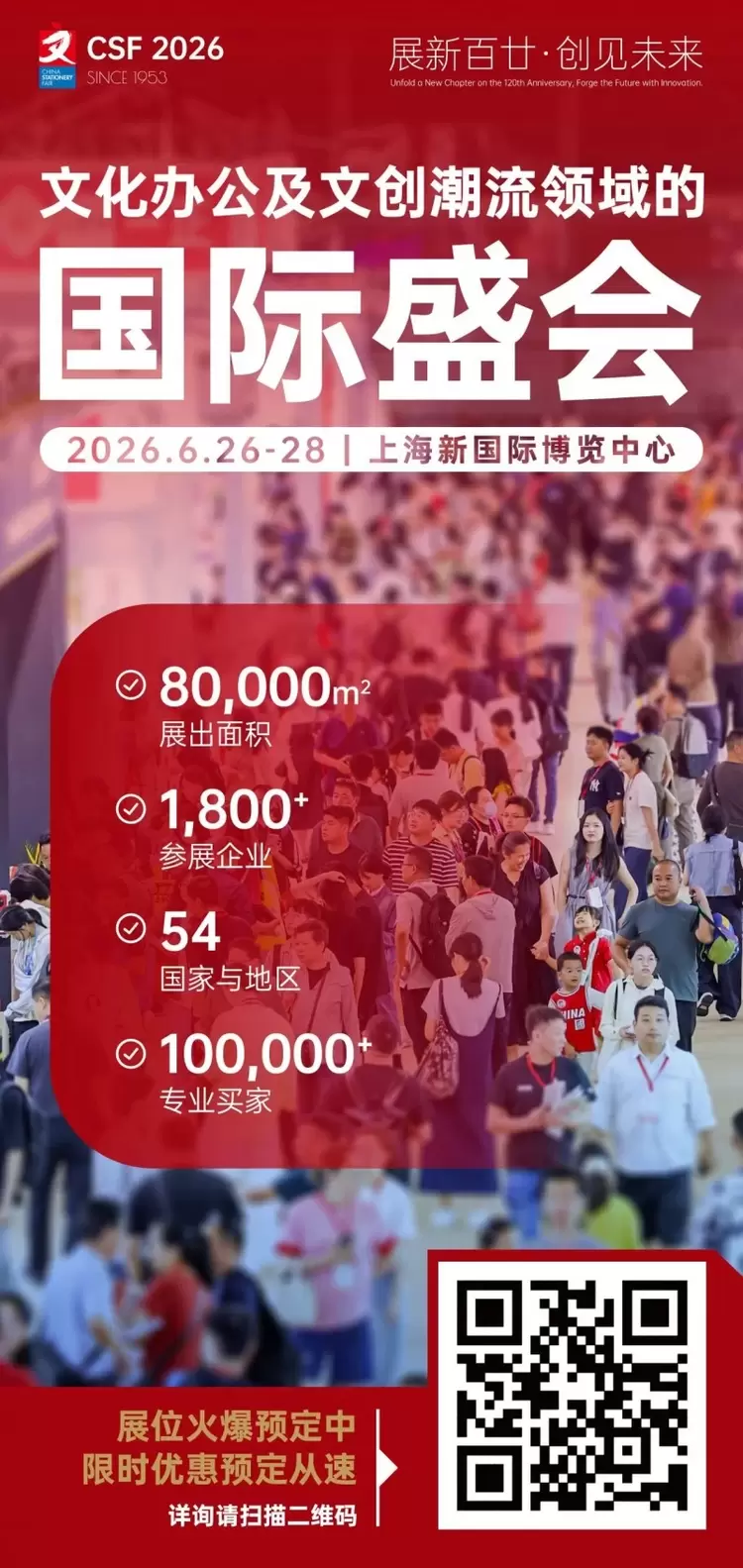为引领新时代文化办公及文创潮流领域的发展趋势,打造文化及文创产品全产业链一站式采购平台,由法国高美艾博展览集团旗下高百赢展览(上海)有限公司主办,中国百货商业协会支持的“第120届中国文化用品商品交易会”(简称“CSF文化会”)将于2026年6月26-28日,在上海新国际博览中心拉开帷幕。