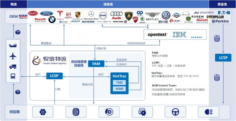 悦信物流的智能化系统贯穿供应链管理服务的全流程,通过自主研发的FAM和VMI系统在供应链管理中的整合应用,可以全面抓取主机厂的实际需求,进行需求预测、监控在途库存、进行库存对比以及管理发货和补货情况,为客户的采购、生产、物流等环节的决策提供有力支持,帮助客户优化产销效能。实时的全程追溯以及与OEM进行数据互通,实现信息一体化与业务协同化,使供应链更稳定,管理更可控!