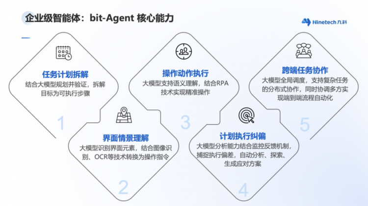 其中,九科信息自主研发的bit-Agent颇具代表性。作为国内首个实现商业化落地的GUI Agent,它打通了“决策-感知-执行-学习”的全链路能力,让其在制造业、金融业等领域快速构建起差异化智能体解决方案。