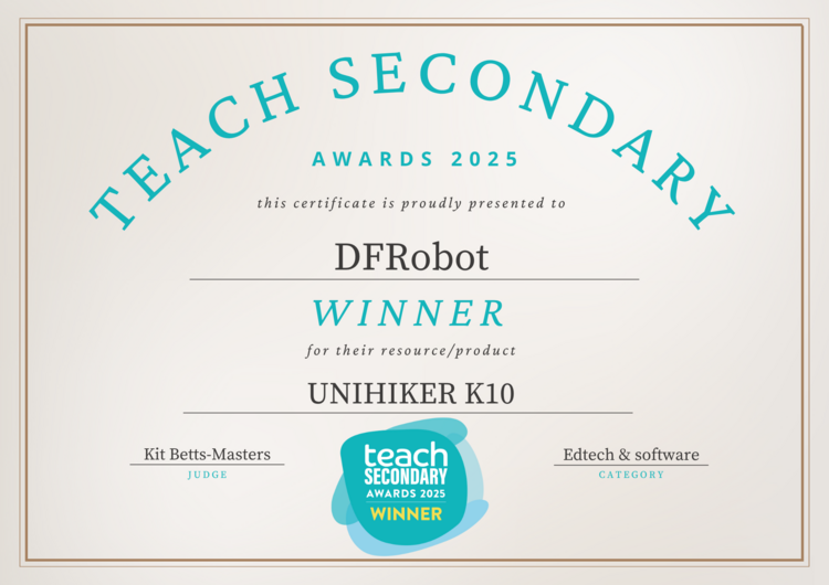 DFRobot行空板K10在2025年TeachCo资源奖评选中,荣获“中学教学技术与软件”类别最高奖项。本届评选由长期支持教育工作的专业机构TeachCo主办,行空板K10凭借在人工智能实践与STEM教育领域的突出贡献,从众多参选产品中脱颖而出,获得评委一致认可。