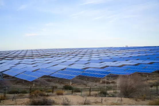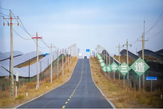 站在全球首个千万千瓦级新能源基地——内蒙古库布齐沙漠鄂尔多斯中北部新能源基地的现场,映入眼帘的是一幅令人震撼的画面:百万块湛蓝色的光伏板阵列在金色沙海中绵延起伏,宛如一片"蓝色海洋"。这条平均宽约5公里的"光伏长城"治沙带,正将黄河与库布齐沙漠隔绝开来,筑起一道坚不可摧的绿色屏障。