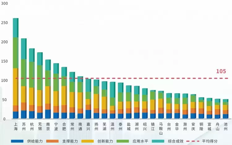 《报告》显示,长三角城市智能制造发展总体呈现以上海为核心引领,苏州、杭州、无锡为三强带动,南京、常州、合肥、宁波、南通为五大重点辐射,多点支撑的总体格局。长三角地区27个中心城市智能制造指数平均值为105,其中9个城市指数在平均值之上。上海市位居长三角各城市榜首,与苏州、杭州、无锡4个城市共同组成第一梯队。