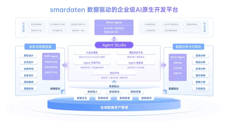 数睿数据smardaten平台是一个集成系统,通过构建“内置AI”的应用Agent Studio可开发出系列AI智能体。目前官方提供的智能体覆盖SWE Agent、Data Agent、Work Agent三类,最终以数据为基础,AI智能体为支撑,帮助企业高效实现数智化转型,提升运营效率和创新能力。