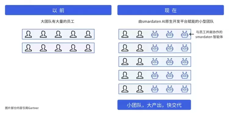 smardaten平台的AI能力带来巨大的生产力提升,使得团队能够以更小、更敏捷的“微型团队”实现媲美大规模传统团队的产出,推动软件开发向工业化、公民化、智能化方向发展。