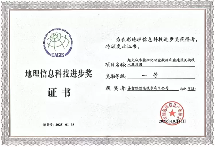 同时,易智瑞公司与上海市大数据中心、北京大学等单位联合完成的“超大城市精细化时空数据底座建设关键技术及应用”项目成果,荣获2025地理信息科技进步奖一等奖。