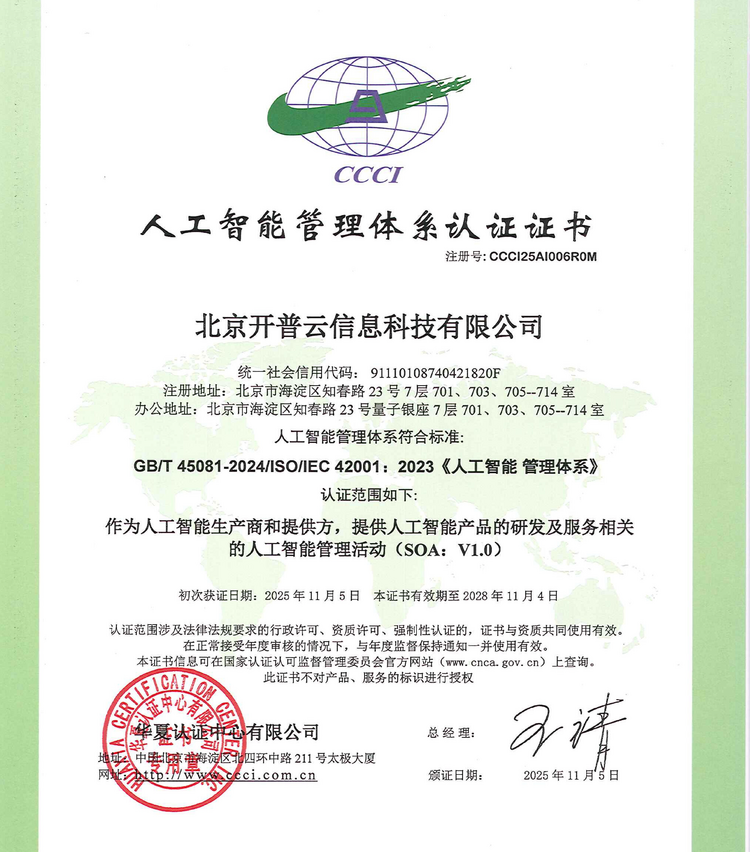 近日,开普云顺利通过权威认证机构审核,成为全球首批荣获GB/T45081:2024/ISO/IEC 42001:2023《人工智能管理体系》(AIMS)认证的企业。