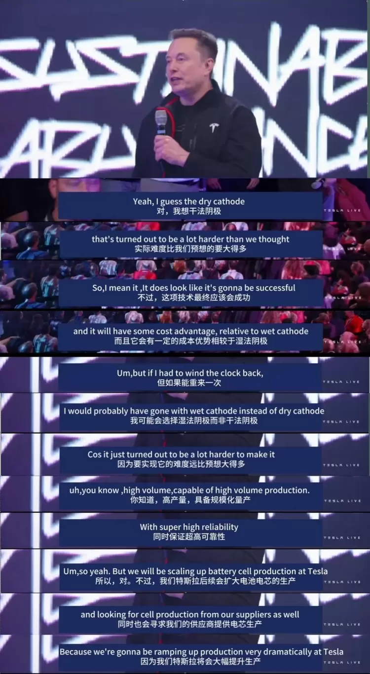 Elon Musk: Yeah, I guess the dry cathode, that's turned out to be a lot harder than we thought. So,I mean it ,It does look like it's gonna be successful,and it will have some cost advantage, relative to wet cathode. Um,but if I had to wind the clock back, I would probably have gone with wet cathode instead of dry cathode.