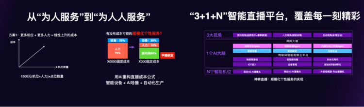我们的答案不是增加摄影师,而是用AI算力取代人的蛮力,依托“3+1+N”智能直播平台,实现规模化、个性化的直播服务。