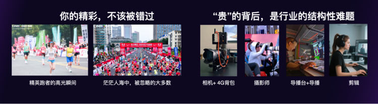 以马拉松为例,一场数万人的比赛,被记录的往往只有精英选手。并非大众不渴望内容,而是专业直播成本高昂——摄影师、设备、差旅、导播、剪辑……这些专业人力与设备堆砌了高成本以及不尽如人意的成果。