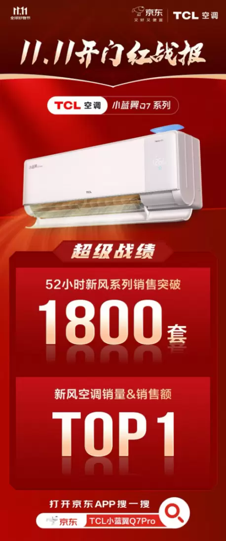 在刚刚结束的2025年双11大促中,TCL空调新风产品线销量一路领先,其中TCL小蓝翼Q7系列空调作为品牌旗下的明星产品,成为驱动增长的核心引擎。该系列产品凭借其在AI健康新风赛道的开创性技术布局与精准的用户体验设计,被誉为“新风空调界的六边形战士”。