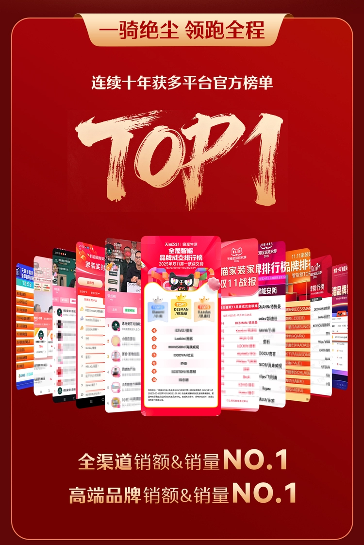 2025年双11购物狂欢季迎来收官,在政府补贴与品牌多元福利的双重驱动下,智能锁领军品牌德施曼在今年双11展现出惊人的增长势能。据德施曼官方战报显示,2025年双11,德施曼实现全渠道销额与销量“十连冠”, 连续十年获多平台官方榜单TOP1,高端市场销额&销量稳居榜首,以断层式领先数据超越第二梯队,持续巩固其绝对领先的市场地位。