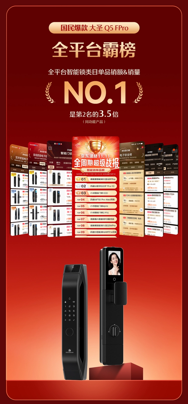 德施曼大圣Q5FPro延续今年618的爆款趋势,在这个双11继续成为智能锁行业的国民爆款,横扫京东、天猫、抖音多个平台官榜的单品销冠,拿下全平台智能锁类目单品销额&销量TOP1,销量是第二名同功能产品的3.5倍。