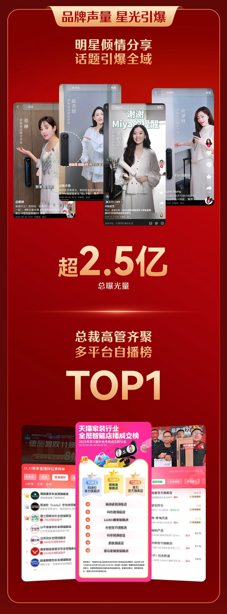 双11期间,德施曼携手蔡琳、张伯芝、熊黛林、陈乔恩等明星进行全域种草,品牌总曝光量超2.5亿;此外,德施曼总裁高管直播加码双11官方直播间,获多平台品牌自播榜TOP1,以高势能传播引爆全场,带动高端系列成交转化,品牌全网声量爆发式增长,实现“星光引爆+总裁高管”双轮驱动。