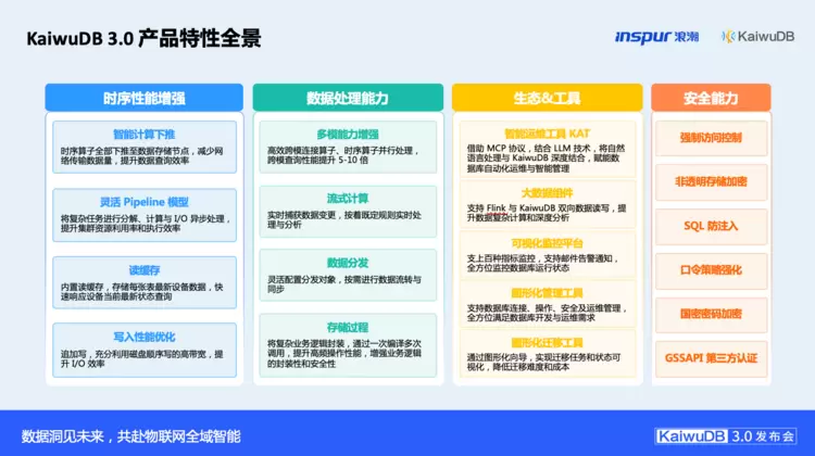 11月12日,在“数据洞见未来,共赴物联网全域智能——浪潮KaiwuDB新品发布会”上,浪潮重磅发布自研分布式多模数据库全新版本KaiwuDBV3.0,及浪潮开务物联网行业数智大脑K-Mind,以期通过将数据技术与AI大模型等前沿技术融合,加速完善产品与服务体系,全方位赋能物联网用户数智化升级。其中,核心产品KaiwuDB V3.0将高性能时序处理、多模融合、分布式、安全特性、AI等诸多能力集于一体,为企业提供高性能、高可靠、低成本且易于运维的一站式数据管理解决方案——助力企业有效应对物联网时代海量、实时、多模数据的管理挑战,实现降本增效和数据驱动业务创新的双重目标。