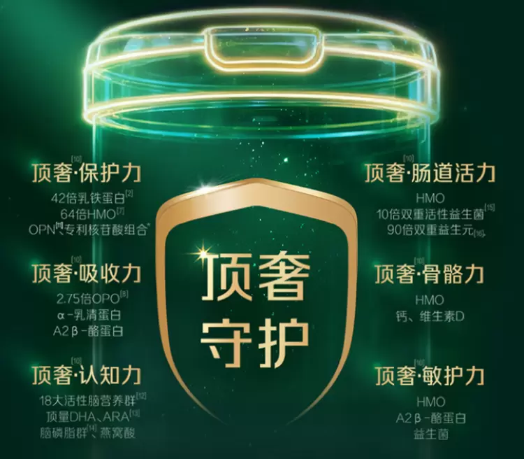 在认知力发育方面,产品以顶量DHA[15]与18大活性脑营养群[16],构建私教级脑营养的高密度脑部营养网络。针对骨骼发育,钙、维生素D、OPO、乳铁蛋白等多维成长因子的高定搭配,能强健宝宝骨骼成长,覆盖宝宝成长关键期的多元营养需求,赢在起跑线。
