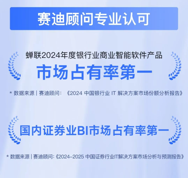 在垂直细分领域,工信部赛迪研究院旗下赛迪顾问的报告进一步印证了思迈特的专业实力。其最新发布的《2024-2025 中国证券行业 IT 解决方案市场分析与预测报告》指出,思迈特位居国内证券业 BI 厂商市场占有率第一。同时其连续多年稳居银行业商业智能软件产品市场占有率榜首,彰显了思迈特在金融 BI 市场的绝对领先优势。