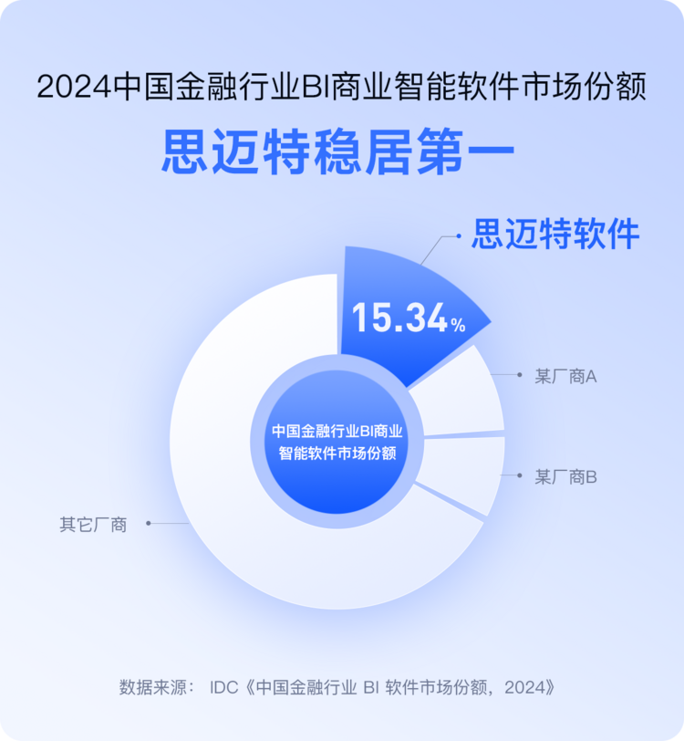 作为全球IT市场研究的权威参考,IDC 最新发布的《中国金融行业 BI 软件市场份额,2024》报告显示,思迈特以15.34% 的市场占有率位居中国金融BI第一。这一成绩源于其自创立以来与金融行业的深度绑定,十余年间深耕数千个大型金融项目,精准匹配行业对性能、稳定性、安全性的严苛需求,形成了独特的行业洞察与技术积淀。