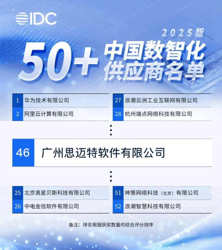 除了细分市场的绝对优势,思迈特的综合服务能力也得到权威机构的高度肯定。近期,公司成功入选 IDC 2025《中国数智化 50 + 供应商推荐》榜单,与华为、阿里云等企业共同跻身国内数智化服务第一阵营。该榜单基于十年“未来企业大奖”数据,从技术平台能力、行业知识储备、生态服务构建三大核心维度严苛筛选,最终仅 52 家企业入选,思迈特的入围标志着其数智化服务能力已通过市场长期验证。