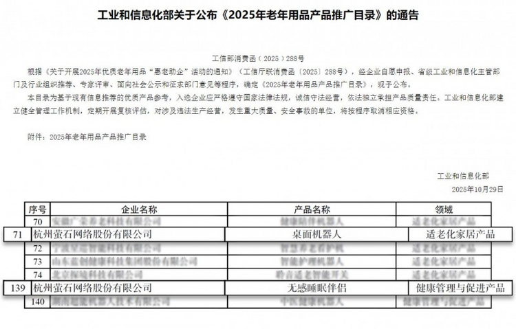 近日,工业和信息化部公示《2025年老年用品产品推广目录》,萤石网络旗下无感睡眠伴侣与RK3桌面机器人凭借卓越的适老设计、创新技术应用及成熟的场景解决方案,成功入选这一国家级推广名单。这一成果既是萤石长期投入适老化研发的重要收获,也彰显了市场与政策对其智慧养老产品 “安全性、实用性、易用性”的高度认可。